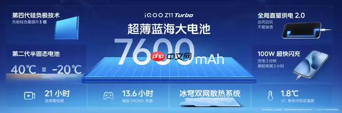 iQOO Z11 Turbo内置7600mAh超薄蓝海电池,采用行业领先的第四代硅负极材料,能量密度高达iQOO全系最高的860Wh/L,续航表现远超同尺寸高性能机型。搭配100W超快闪充与全局直驱供电2.0技术,边玩边充不发热、不伤电芯,一杯咖啡时间即可充入超半数电量。