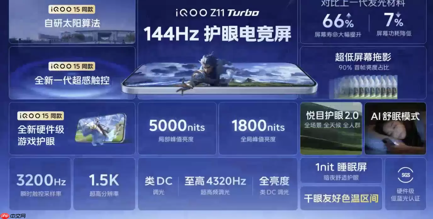 在护眼功能上,iQOO Z11 Turbo可谓不遗余力。屏幕集成了多项护眼特性,全面覆盖硬件与软件层面,包括:莱茵DC调光、4320Hz超高PWM调光、软件级全DC调光、夜猫护眼2.0、游戏护眼2.0以及个性化亮度2.0等,旨在为用户提供全天候的舒适观看体验。