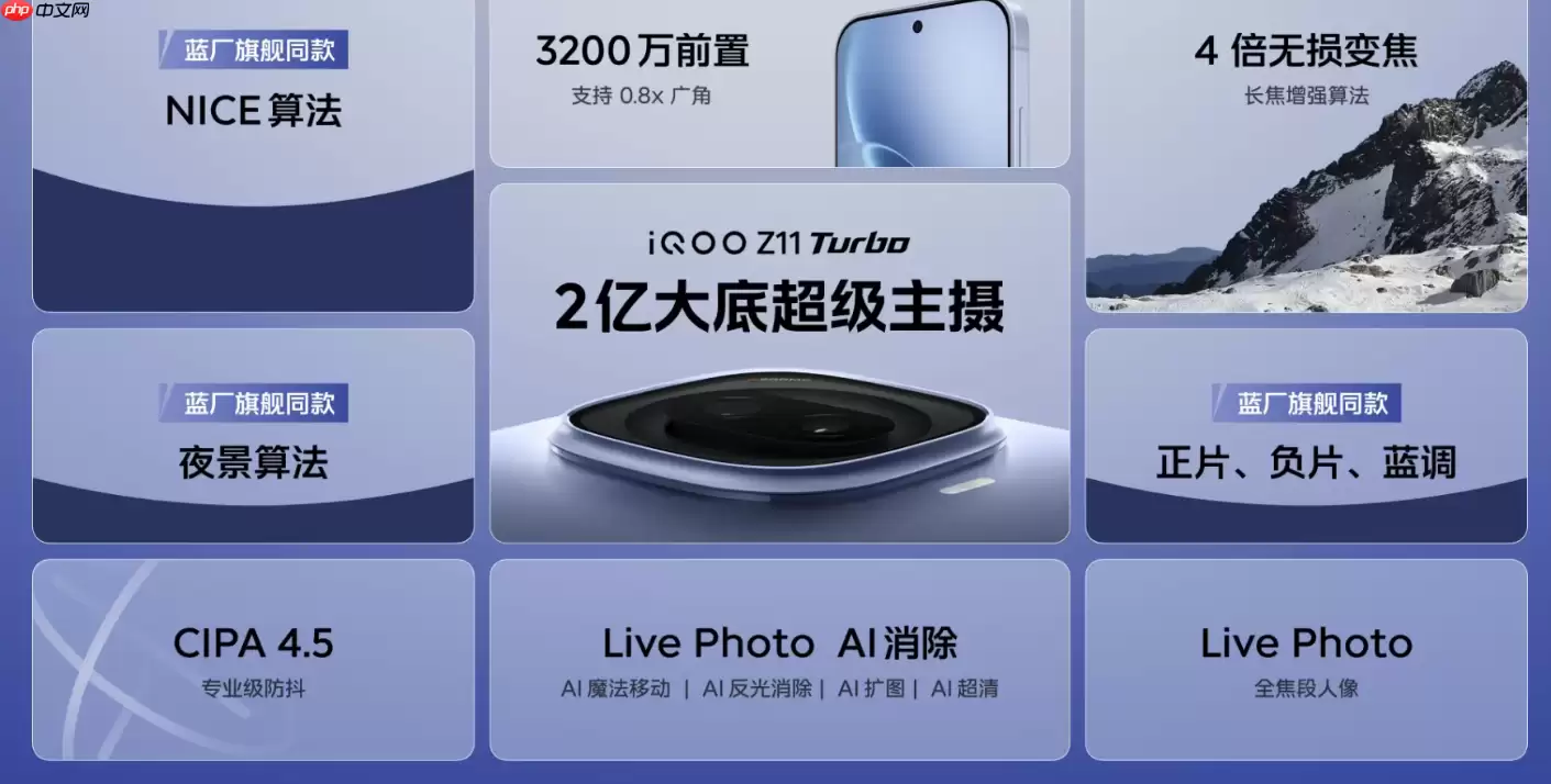 影像系统方面,iQOO Z11 Turbo采用了后置双摄组合:主摄为2亿像素HP5传感器,拥有1/1.56英寸大底和f/1.88大光圈,支持4倍无损变焦、40倍数码变焦,并搭载了NICE影像算法,无论是白天还是暗光,都能捕捉清晰细节。副摄为一颗800万像素超广角镜头,视野开阔,适合拍摄风光或多人合影。前置则为3200万像素AI自拍镜头,支持0.8倍大视野角拍摄,自拍体验更佳。