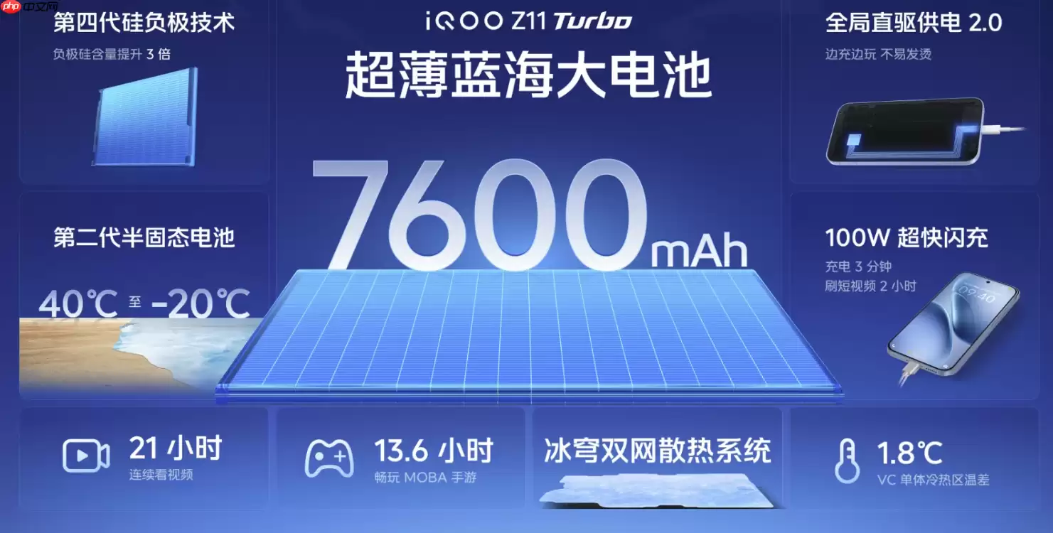 续航能力是iQOO Z11 Turbo的另一大亮点。其内置了7600mAh超薄蓝海电池,并依托第四代硅负极技术,使得负极硅含量较前代提升3倍,能量密度提升14%,在有限的机身空间内实现了电量最大化。