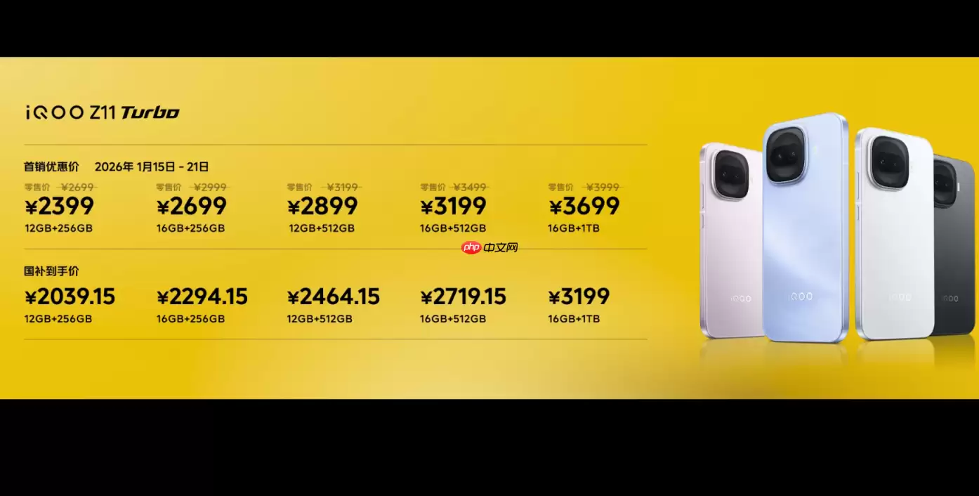 价格方面,iQOO Z11 Turbo提供12GB+256GB版本,官方售价2699元起。在首销期间,用户可立减300元,叠加国家以旧换新补贴后,到手价低至2039.15元。发布会结束后,新机即刻开启销售。