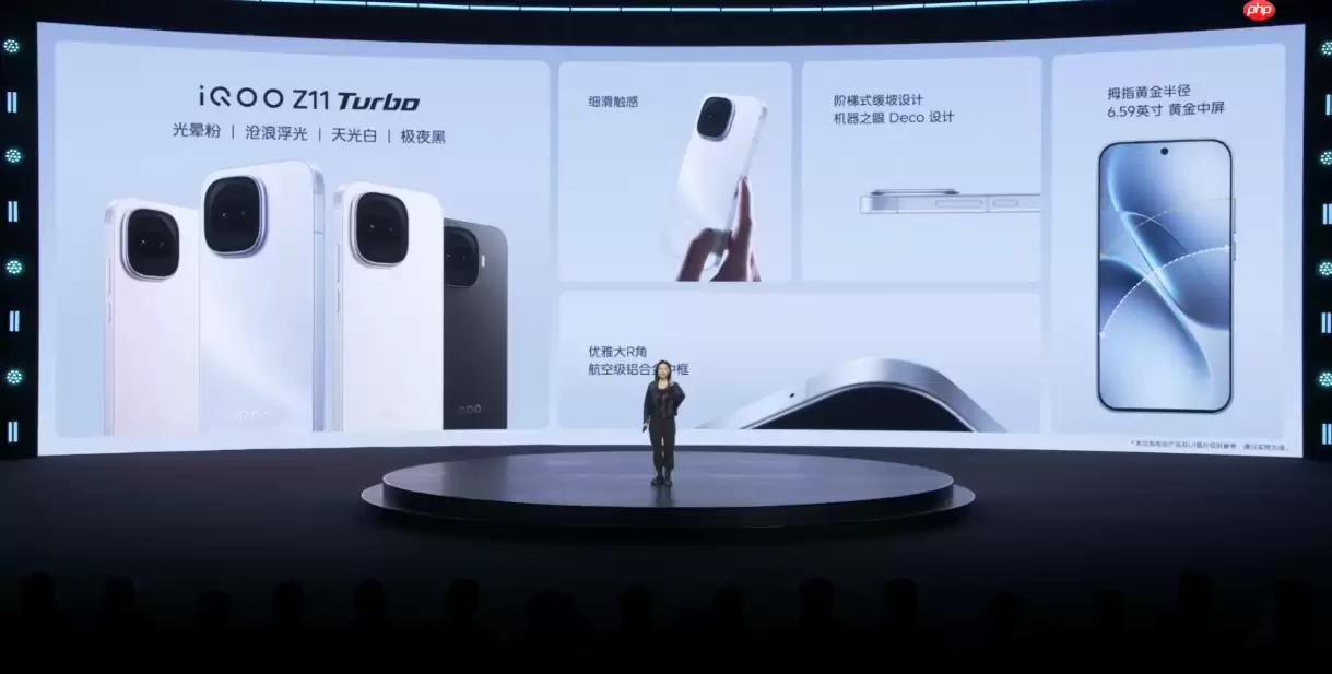 iQOO Z11 Turbo在外观上提供了四款配色选择,分别为:沧浪浮光、光晕粉、天光白与极夜黑。其中,极夜黑版本采用了独特的玻纤材质后盖,整机厚度仅为7.9毫米,手感更为纤薄;其余三款配色则搭载了玻璃后盖,机身厚度为8.1毫米,同样兼顾了质感与耐用性。