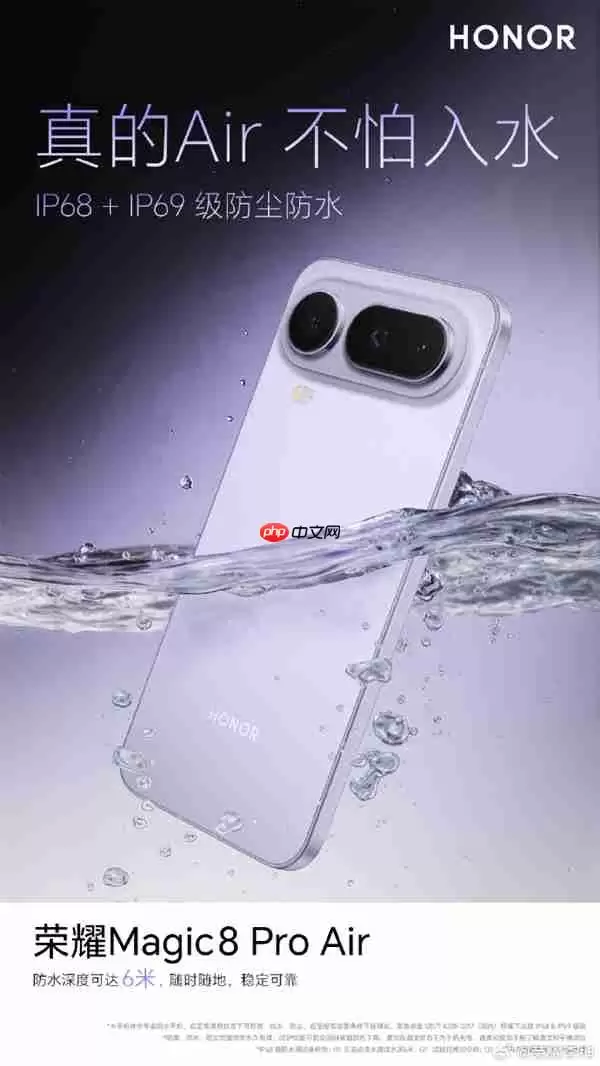 除了通信,新机在耐用性与影音体验上也毫不妥协。荣耀Magic8 Pro Air搭载了对称式立体声双扬声器,带来沉浸式的音频享受。同时,该机具备了IP68与IP69双重防尘防水认证,应对各种严苛环境。其中框采用了荣耀自研的高强度7系铝合金材质,整体可承受高达100公斤的抗弯压力。这意味着,即便日常放入裤袋后坐下,也完全不必担心机身会发生形变,实用性大幅提升。