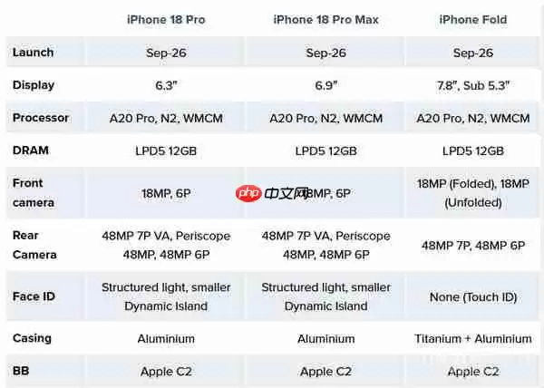 此外,根据其援引GF Securities数据整理的核心配置信息,iPhone 18 Pro系列与iPhone Fold的主要硬件规格对比如下: