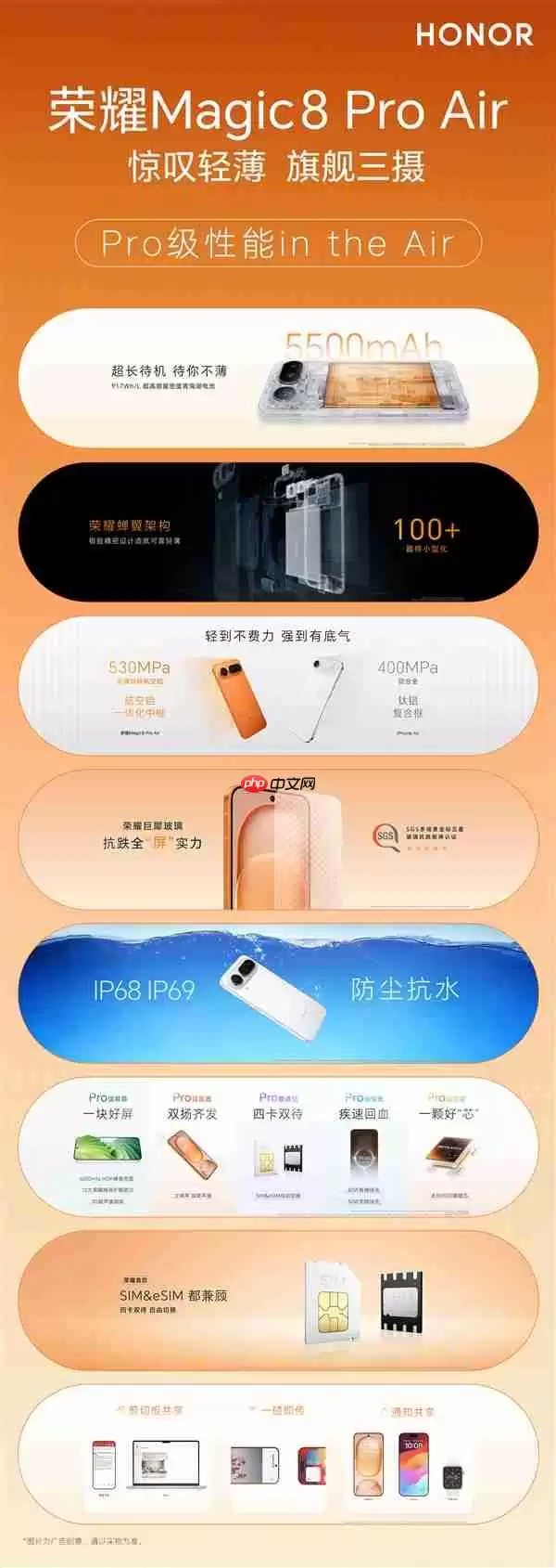 在网络连接方面,荣耀Magic8 Pro Air支持eSIM功能,可实现物理SIM卡与eSIM双卡并行,并支持灵活切换四卡双待模式,充分满足多卡用户和全球漫游人士的通讯需求。