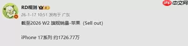 具体数字进一步佐证了其增长动能。根据数码博主“RD观测”公布的信息,截至2026年第二周,iPhone 17系列在中国市场的累计出货量已达约1726.77万台。这一成绩是在持续攀升中达成的——早在2025年底,其累计销量就已突破1557.27万台。更早的数据显示,该系列上市仅50天,国内销量便迅速突破900万台,同比增幅高达50%。