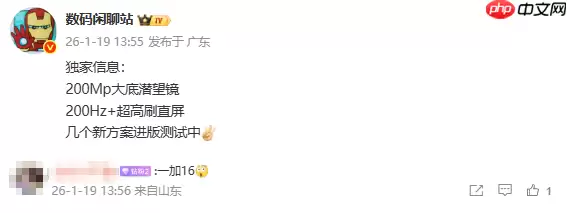 1月19日,知名数码博主@数码闲聊站在社交媒体发布爆料,透露一款即将亮相的新机型将搭载一枚2亿像素大底潜望式长焦镜头,并将配备刷新率突破200Hz的屏幕。从博主的配图情绪线索及评论区热议内容来看,这款新机极有可能来自一加旗下。