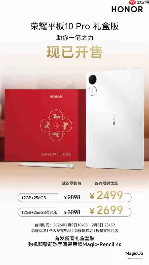 1月19日晚,荣耀正式推出备受瞩目的荣耀平板10 Pro礼盒版。这款新品套装不仅包含了平板本身,还直接附赠了全新升级的荣耀Magic-Pencil 4s手写笔,首发特惠价极具吸引力,仅需2499元起。