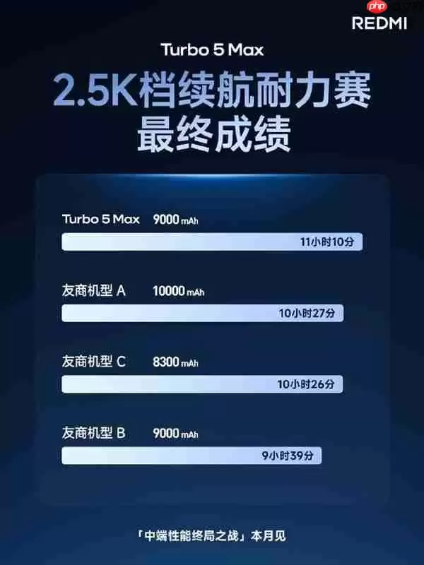 得益于超高能量密度,即便用户高强度使用,也能轻松满足全天的续航需求。在官方组织的续航耐力测试直播中,Redmi Turbo 5 Max实测续航时间达到了11小时10分钟,比搭载10000mAh电池的竞品机型还多出43分钟,实力可见一斑。