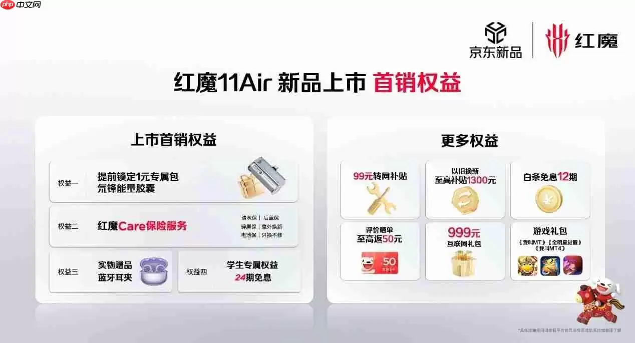 首销期间下单即享多重专属权益:1元抢购红魔氘锋能量胶囊、红魔Care延保服务、蓝牙耳机、99元转网补贴、以旧换新至高抵扣1300元、999元互联网大礼包、晒单评价返现最高50元、《全明星觉醒》《我叫MT》《我叫MT4》等热门游戏礼包、白条12期免息、学生专享24期免息等超值福利。