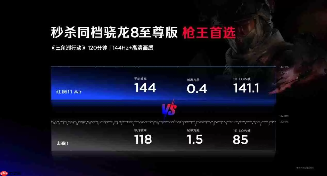 在144Hz高清画质下连续运行120分钟《三角洲行动》,红魔11 Air平均帧率稳定在144帧,1% Low帧达141.1帧;对比机型平均帧率为118帧,1% Low帧仅为85帧。