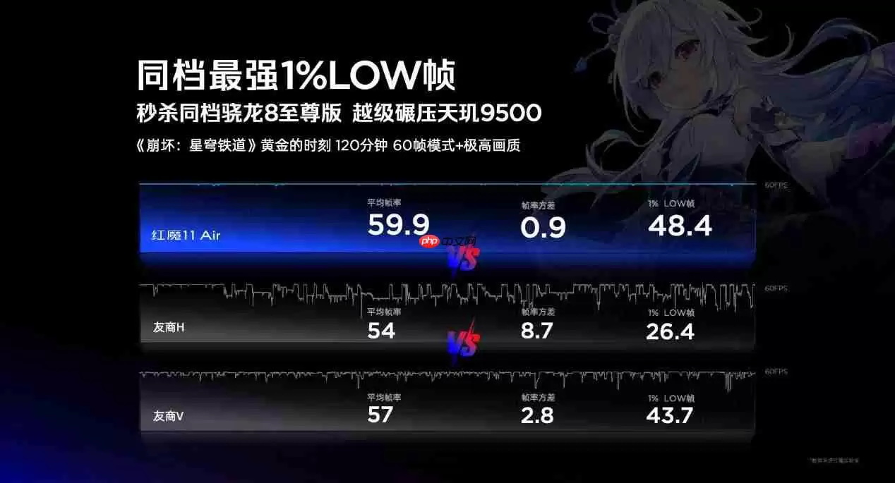 在60Hz极高画质下进行120分钟《崩坏:星穹铁道》“黄金的时刻”测试,红魔11 Air平均帧率59.9帧,1% Low帧48.4帧;对比机型H平均帧率54帧(1% Low帧26.4帧),对比机型V平均帧率57帧(1% Low帧43.7帧)。
