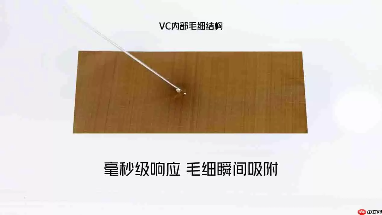 发布会现场,红魔还通过可视化演示直观呈现VC均热板性能:水滴接触VC表面后瞬间被吸附并均匀铺展,充分印证其卓越导热效率。