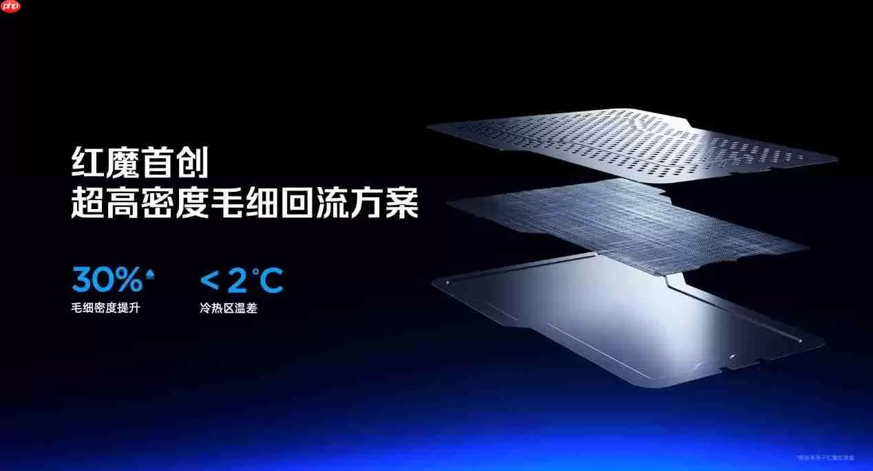 VC内部结构亦有重大突破:红魔首创超高密度毛细回流通道,毛细密度提升30%,冷却液回流速度大幅提升。据官方数据显示,该超厚冰阶VC可将冷热区温差控制在2℃以内,实现极速均温与高效散热。