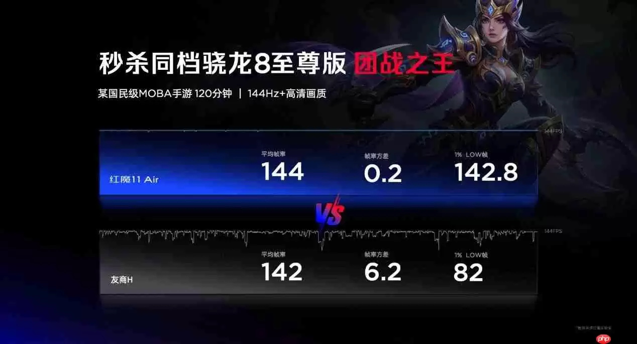 在144Hz高清画质下运行120分钟某国民级MOBA手游,红魔11 Air平均帧率维持144帧,1% Low帧为142.8帧;对比机型平均帧率142帧,1% Low帧仅82帧。