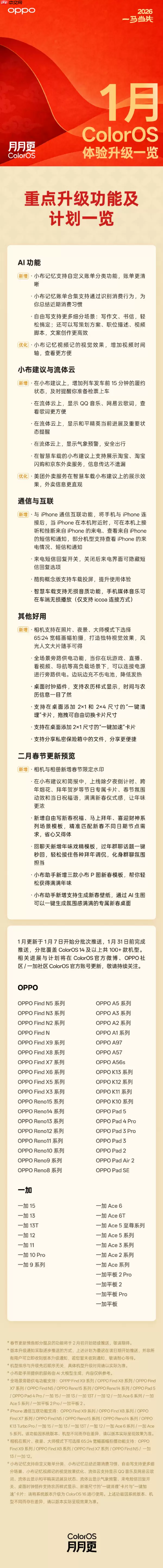 据悉,本次体验更新已于1月7日起分批推送,并预计在1月31日前,全面覆盖ColorOS 14及更高版本的100余款机型,确保广大用户能在春节前获得更流畅、贴心的系统体验。