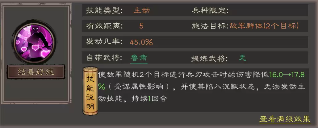 在《三国乱世霸王》中,鲁肃被定位为吴国阵营的核心辅助控制武将。他之所以能获得T0梯度的顶级评价,主要依赖于其自带的主动技能“结善好施”。