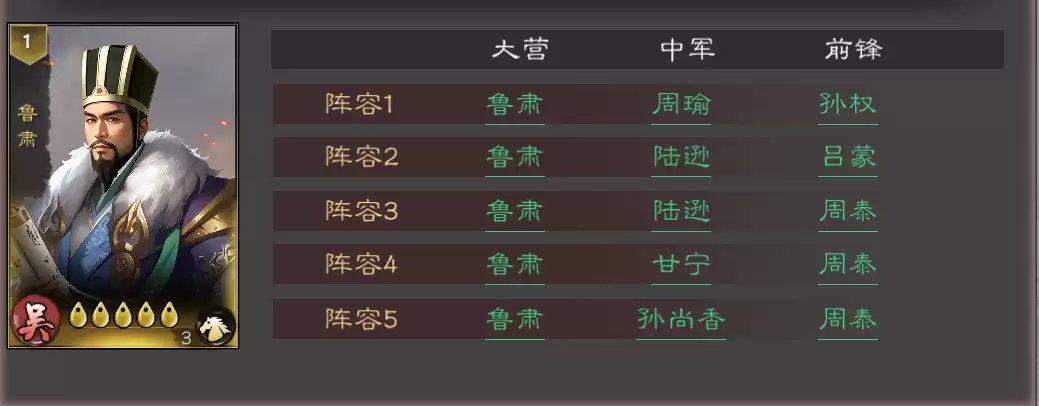 鲁肃的推荐站位是中军,同时也能胜任大营的位置。他与东吴阵营的武将契合度极高,以下是五套经过实战检验的核心阵容方案,供各位主公参考:
