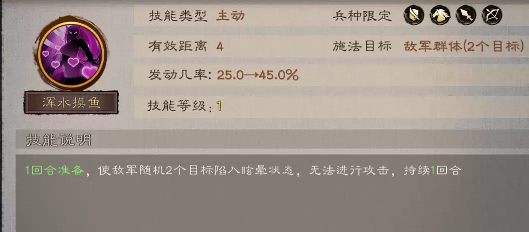 其发动概率为45%,且需要1回合准备。发动成功后,仅能让敌军2个目标陷入1回合的瞋晕状态(既无法行动也无法发动主动战法)。由于其发动概率相对较低,控制时长也较短,在众多控制技能中,其实用性显得较为薄弱。因此,该技能更适合作为极端控制体系(如追求极限控制链的队伍)的补充选择,而非核心控制手段。