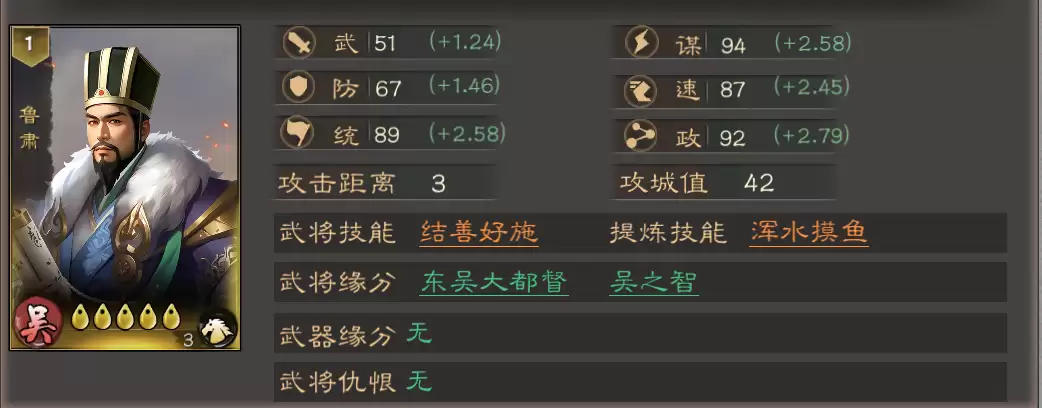 该技能集减伤与沉默效果于一身,能有效限制敌军主动技能的释放并降低我方受到的兵刃伤害,是东吴防御体系中的灵魂人物。从基础属性来看,鲁肃也颇为出色,其高额的谋略(初始94,成长+2.58)与速度(初始87,成长+2.45)是他的核心优势。他的攻击距离为3,攻城值42,非常适合放置在中军位置。凭借“减伤+沉默”的复合辅助效果,鲁肃当之无愧是东吴体系中不可或缺的辅助核心。