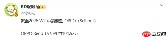 近期,数码圈知名爆料博主“RD观测”公布的一组数据,揭示了OPPO Reno15系列在市场上的强劲势头。数据显示,截至2026年第二周,该系列在国内的总销量已成功突破104.52万台大关。
