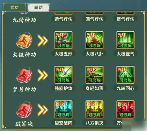 - 队伍偏重输出:则携带能提升团队攻击的Buff光环,例如“太极无形”、“强筋健体”、“九转回心”。