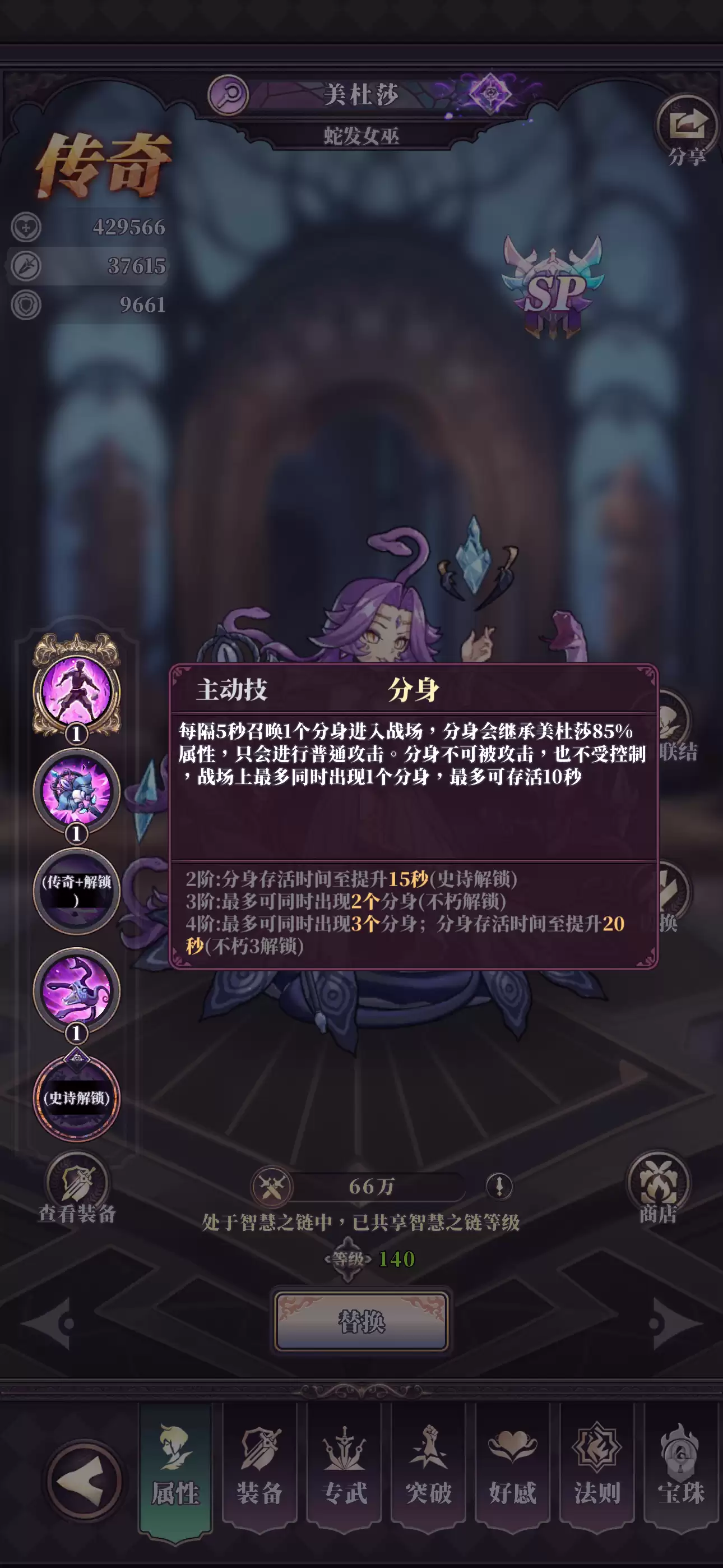 效果:召唤分身并让分身承担伤害。满级时可拥有三个分身,可以考虑为其开辟召唤队伍。在高级别下,高达90%的伤害将由分身承担,这使得她在持续输出环境中表现得异常坚韧。与神法的“无法选中”机制不同,美杜莎通过分身承伤来加强生存,具体哪种更优需根据实战环境判断。