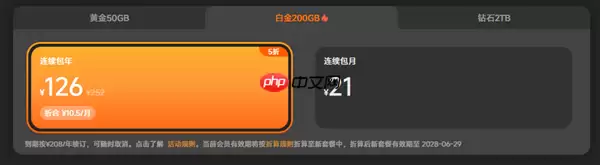 - 200GB连续包年:售价126元,折合每月费用为10.5元。