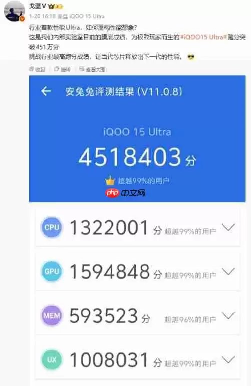 在性能表现上,iQOO 15 Ultra已经显露出王者之相。此前,iQOO产品经理@戈蓝V曾透露,这款新机在内部实验室测试中取得了惊人的451万分成绩。官方明确表示,iQOO 15 Ultra将挑战行业的最高性能纪录,其目标在于充分释放当代旗舰芯片的极限潜力,为重度游戏与专业应用场景提供强大动力。