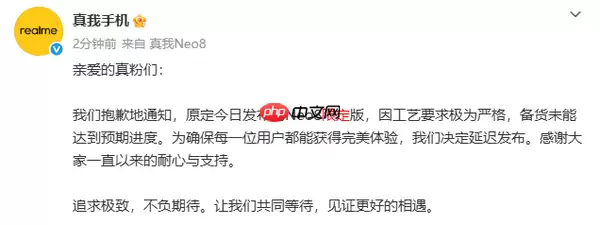 1月22日对不少手机爱好者来说是个特别的日子。原计划于当天与大家见面的realme“真我Neo 8三星堆限定版”,官方临时宣布将暂缓发布。这一消息通过realme官方微博声明发布,瞬间引发了数码圈的关注。