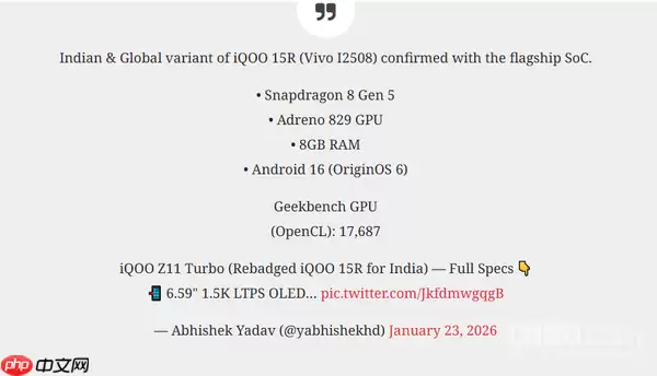 根据Geekbench测试页面公布的信息,iQOO 15R将有望首发搭载高通即将推出的旗舰芯片——骁龙8 Gen5移动平台。这颗芯片的CPU架构采用了“6+2”的设计:包括6个频率为3.32GHz的性能核心,以及2个主频高达3.80GHz的超大核,旨在提供顶级的运算性能与能效表现。测试机型的内存配置为8GB,系统层面则运行着基于Android 16深度定制的OriginOS 6操作系统。