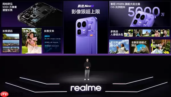 影像系统上,真我Neo8的后置三摄组合配置全面。它包括了5000万像素的IMX896旗舰主摄(搭载1/1.56英寸大底,支持OIS光学防抖)、一枚800万像素的超广角镜头,以及一颗在同档位中较为罕见的5000万像素3.5倍光学变焦潜望式长焦镜头。