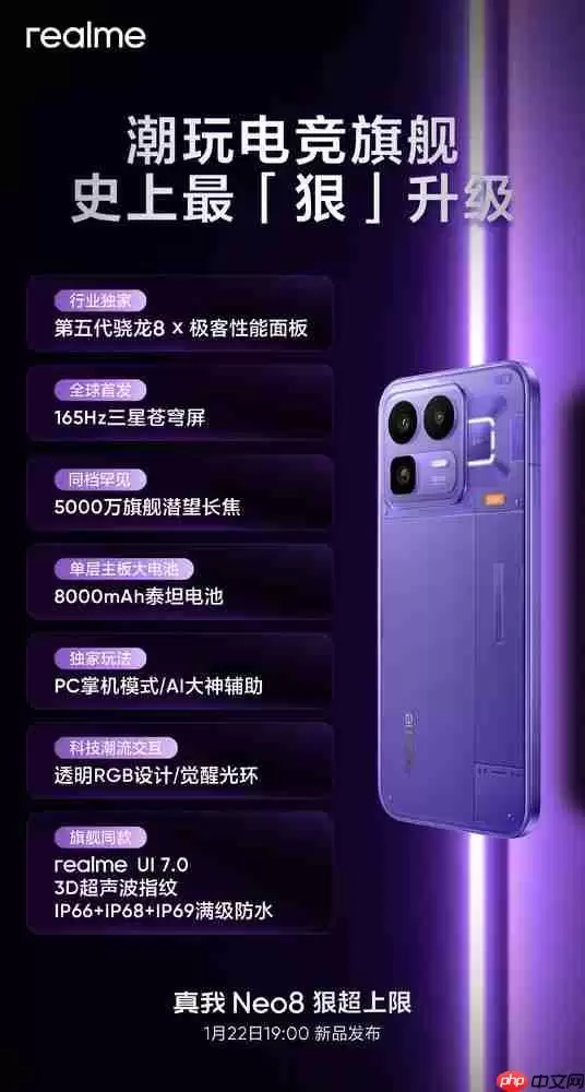 1月22日晚7时,realme真我于线上新品发布会上,正式揭晓了其年度潮玩电竞旗舰手机——真我Neo8,为年轻玩家群体带来了全新的性能与视觉体验。