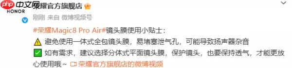 2025年1月23日,荣耀官方针对其新款机型Magic8 Pro Air发布了一项重要的镜头膜使用提醒。官方明确指出:为避免影响手机性能,建议用户切勿为手机后置镜头贴覆一体式全覆盖镜头膜。这类设计容易遮挡机身散热所需的排气孔,可能导致设备散热不畅,进而引发扬声器产生杂音。