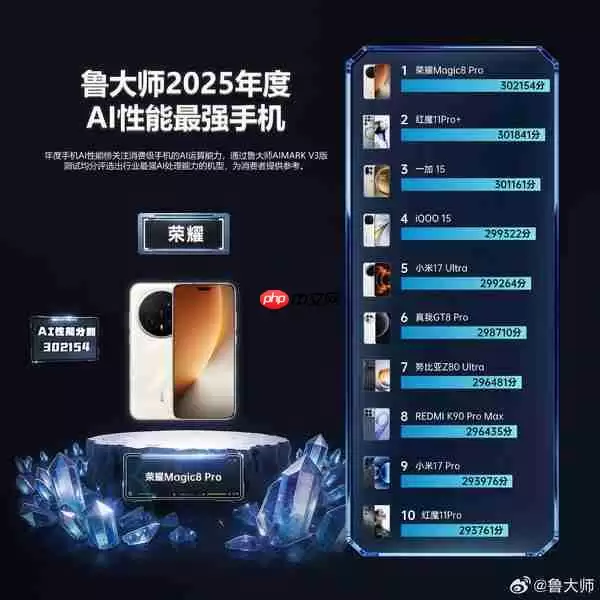 日前,国内知名评测机构鲁大师正式公布了“2025年度AI性能最强手机”榜单。在这一权威榜单中,荣耀Magic8 Pro以高达302154分的AI性能得分强势登顶,荣获本年度AI算力表现最卓越的智能手机称号。