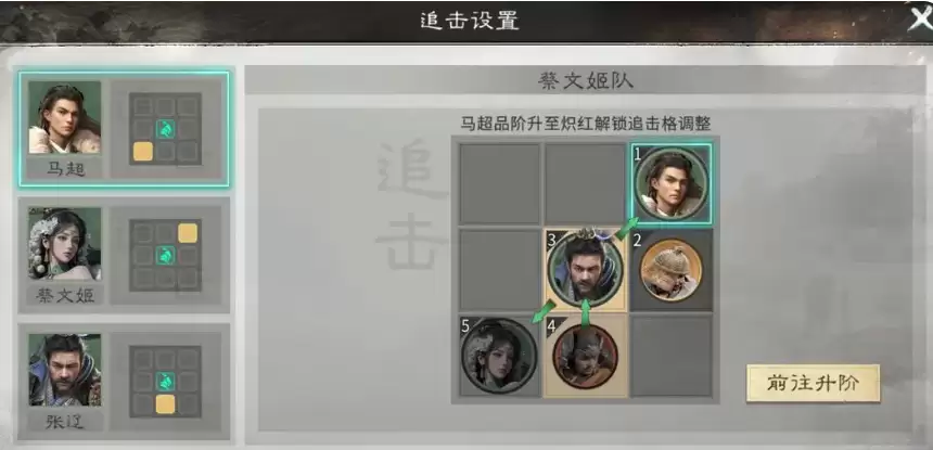 然后张辽的话,在这里可以带白虹贯日之类的技能,对面的敌人造成输出的时候,是根据所在行列的敌人,对他造成输出之后还可以根据张辽自身天赋带来足够的点杀能力,后期追击的话,大家可以带横刀耀武,这个技能对敌方目前武力数值最低的一个目标来说,造成的伤害是能够达到最高数值的,蔡文姬在这个阵容里面就是辅助定位的角色,她能够带来的一个主力技能就用鼎力相助技能,这样的话就可以让踩中追击格子的武将带来足够的伤害加成。