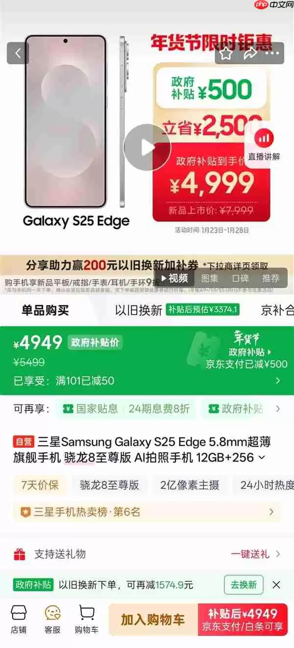 无独有偶,作为苹果在超轻薄旗舰市场的直接竞争对手,三星Galaxy S25 Edge也同步启动了强有力的促销活动。在三星京东自营旗舰店,该机型直降2500元。同样在享受国家补贴后,用户实际支付金额仅为4999元。相比其首发价7999元,累计优惠幅度高达3000元。(数据截至2026年1月24日)