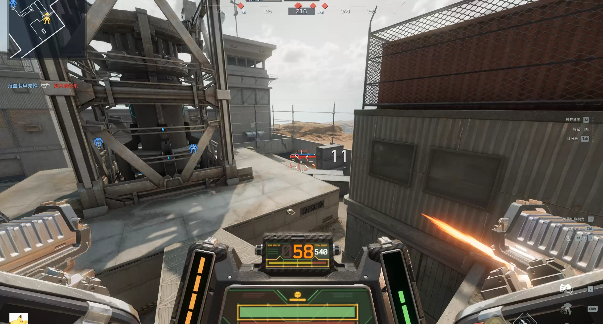 这里有几个集装箱,一方面处于敌人复活点后,如果敌人专注打正面的机甲,那来到这里就可以偷敌人的背身,即便敌人来集火,这里还有集装箱可以抵挡伤害,使用冲刺能与敌人进行周旋,完成反杀。