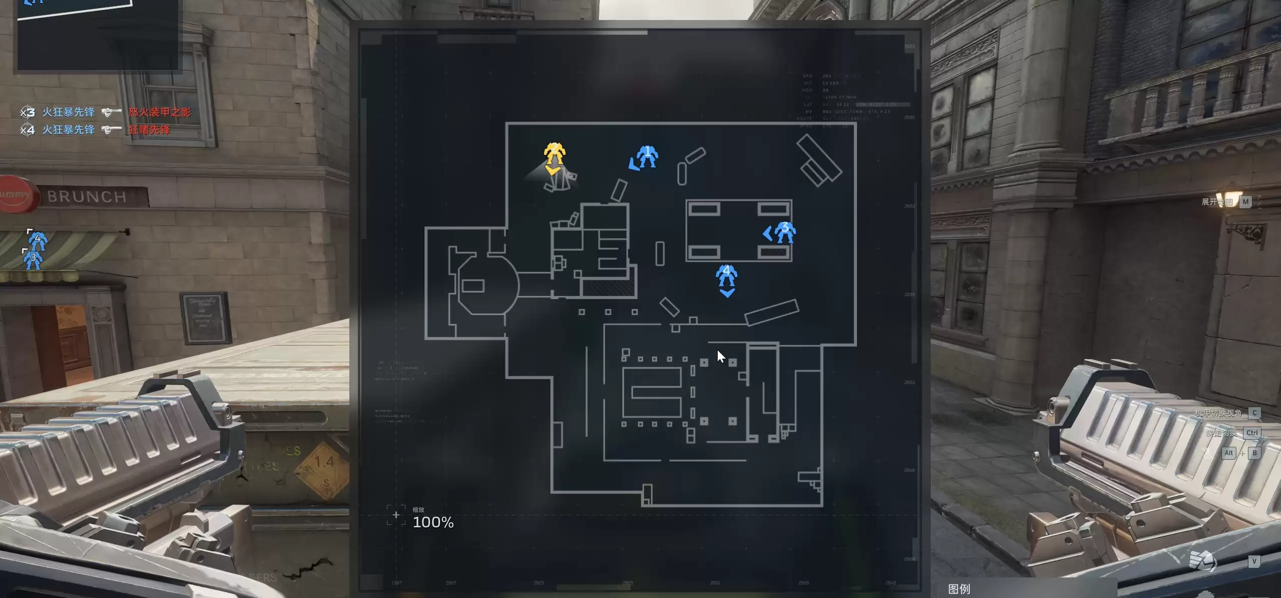 第一个点位是广场与教堂之间的空地,可以旋转视角消灭教堂与咖啡店刷新的敌人。