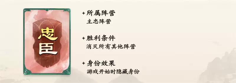 忠臣在开局时可以看见主公身份标识,可以搭配主公选择身份,在开局时可以先做好“工具人”的自我认知,自己可以死、但必须保护好主公。