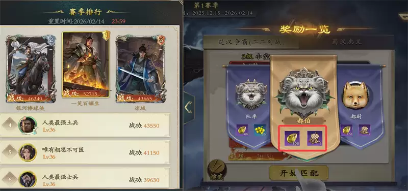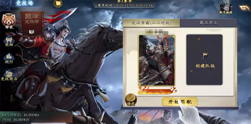 萌新玩家可以率先尝试游戏内的竞技玩法,目前竞技场分为2V2楚汉争霸与蜀汉忠义两个模式。