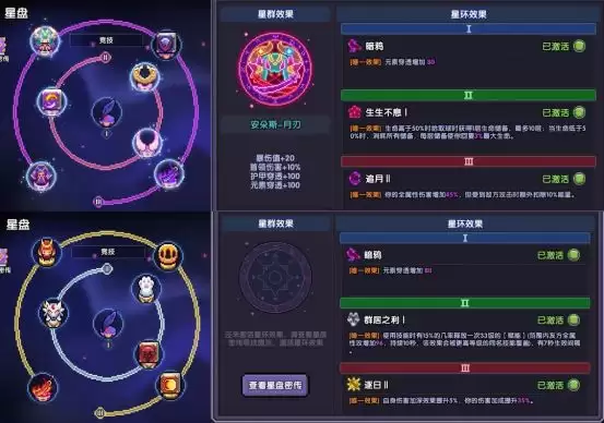 星盘概述:星盘共有3圈,每一圈装上相同的星棋激活后可以获得属性,如果达成星棋组合,则会额外触发效果。