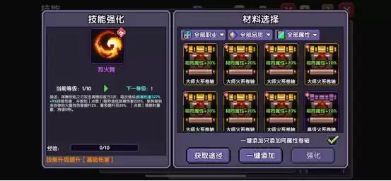 技能升级需要同属性的经验卷轴,可以在商城,技巧试炼,活动商店,技能宝箱中获得。