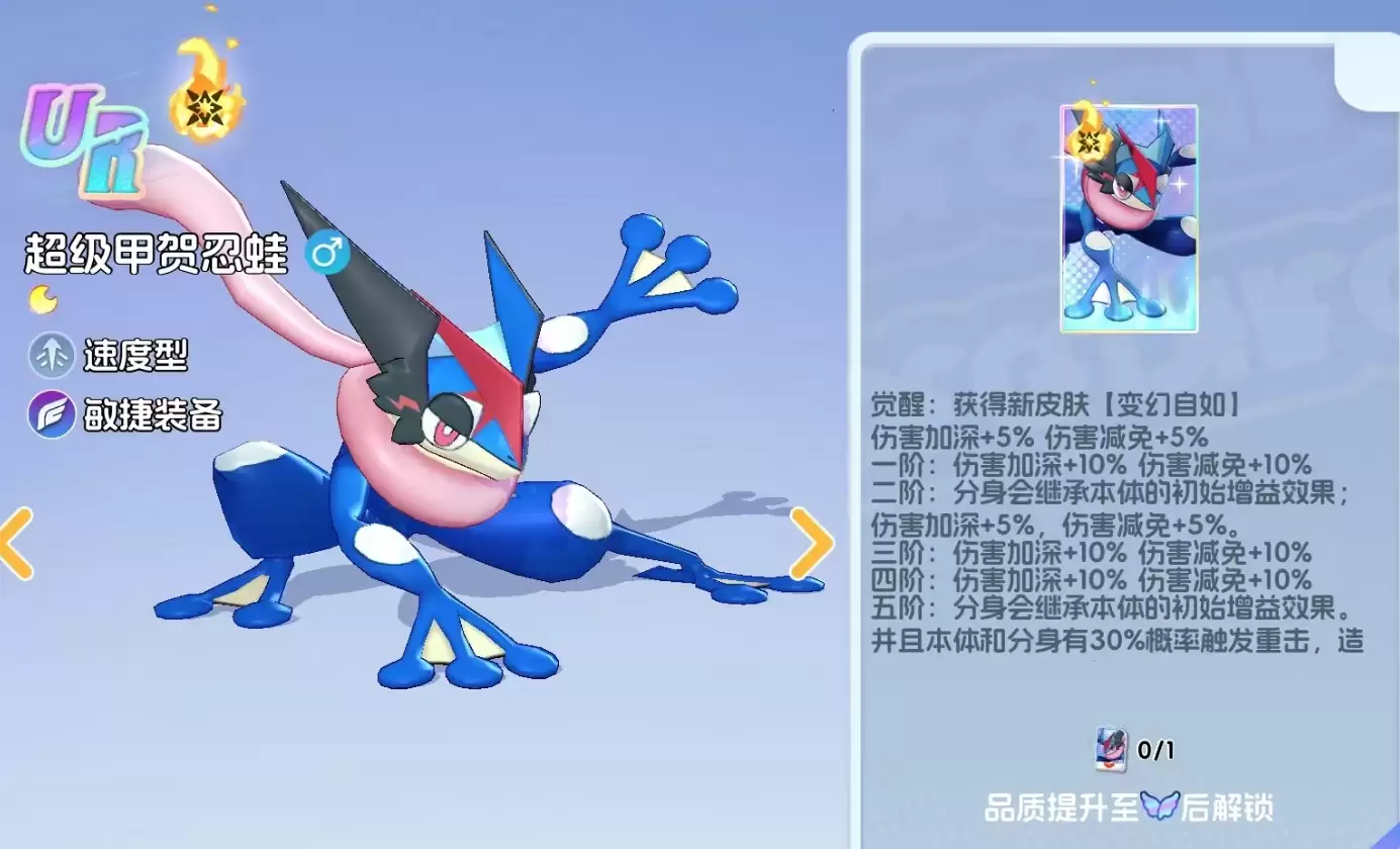 与其他UR宝可梦一样,超级甲贺忍蛙在完成MEGA进化后,将额外获得一个觉醒技能,形态也会发生显著变化。觉醒技能除了能为超级甲贺忍蛙提供增伤和伤害减免外,还能在释放影分身后,令影分身继承本体初始的增益效果,从而强化影分身的输出能力。