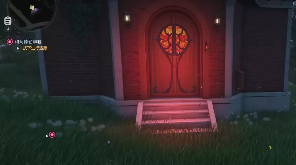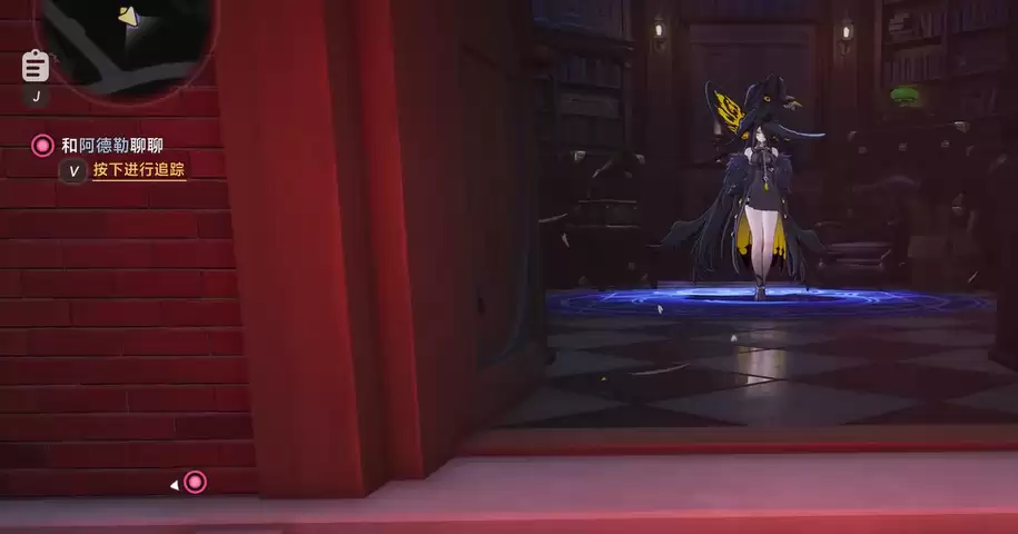 到达目的地后,你会看到一栋红色的小房子,其独特的设计风格让人一眼就能认出。走到房门前,对着门敲一下,就会触发一段过场动画。画面中会先闪过一顶黑色帽子,随后出现一位穿着魔女风格服装的人物——她就是魔女之家的主人黑羽。