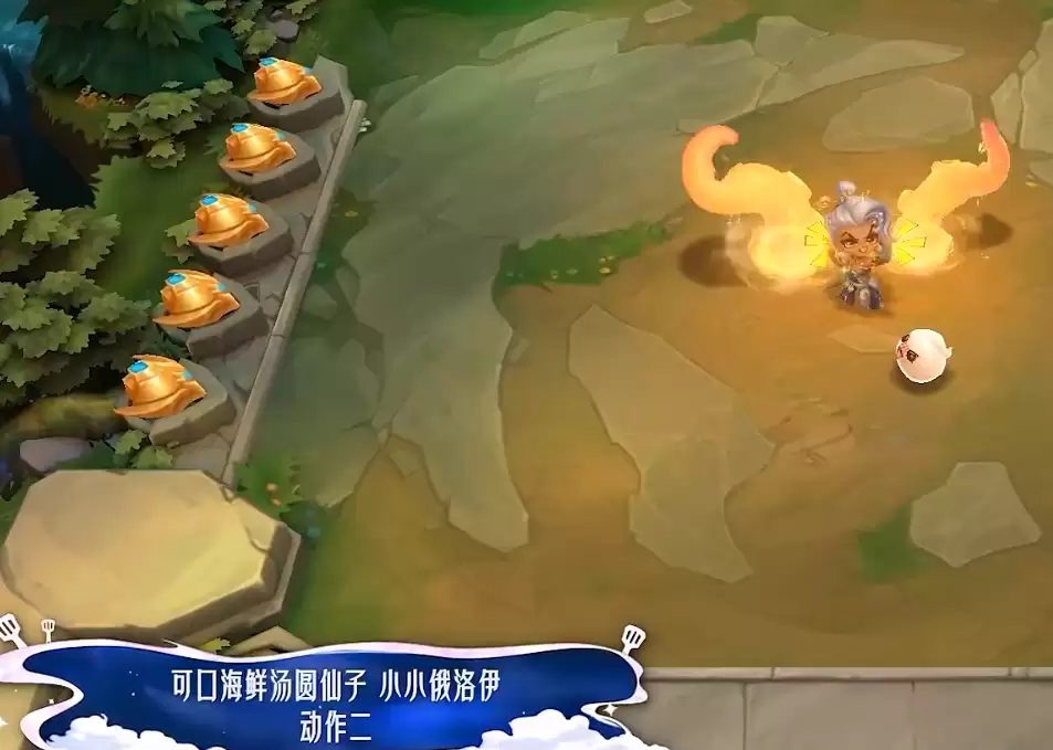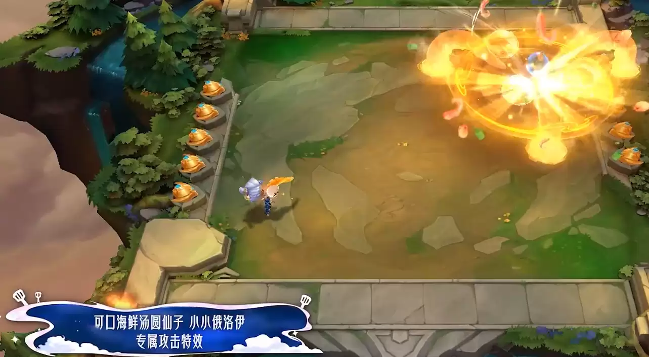 专属淘汰特效:粗壮的汤圆触手会缠绕敌方小小英雄,将其拖至冒着热气的迷你海鲜汤锅上方。敌方被金色蒸汽包裹后,会化作几颗小汤圆粒子消散。俄洛伊还会做出“掀锅盖”的收尾动作,搭配咕噜冒泡的音效,趣味性十足。