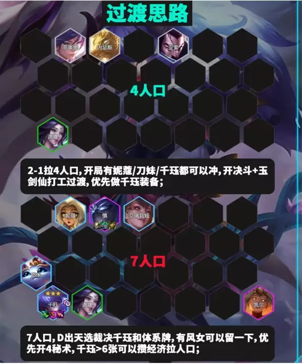 2-1准时拉4,开2决斗+2玉剑仙,用1费天选打工;2-5拉5,3-2拉6,每回合留30金吃利息,坚决不D牌;期间只留千珏、刀妹、妮蔻、慎等体系牌,其他全卖。