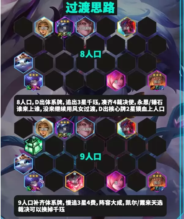 4、9人口不强求——经济差、血线低时,8人口3星千珏+2星凯尔+4裁决+4秘术,足够吃鸡,不用硬拉9。