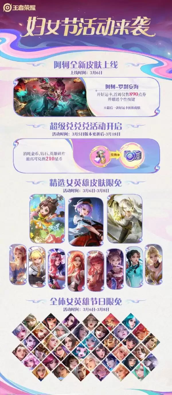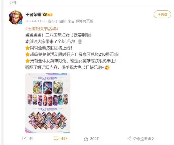 3月4日,《王者荣耀》官方账号发布消息,正式开启妇女节系列主题活动,为玩家带来多重福利。