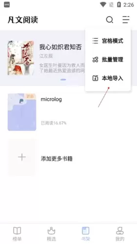 在更多功能中,选择“导入书籍”功能,您还可以将手机本地存储的电子书文件(如TXT、EPUB格式)导入到凡文阅读的书架中进行统一管理。